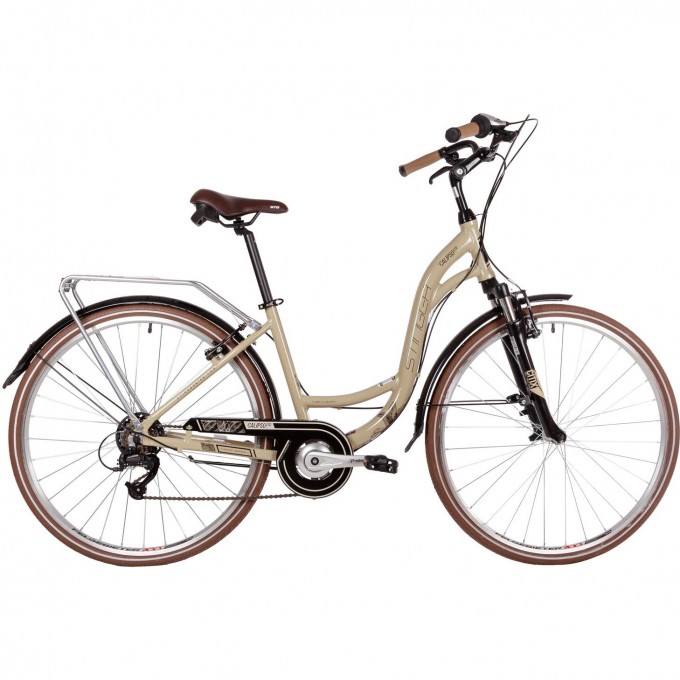 Городской велосипед из женской линейки велосипедов для повседневной эксплуатации STINGER CALIPSO STD предназначен для прогулок, фитнеса и использования велосипеда как транспортного средства, например, поездок по городу. Рама выполнена в геометрии комфортной посадки и лишена верхней трубы переднего треугольника, при этом, имеет два усиления несущей трубы, а также стоит обратить внимание на расположение крепления под дисковый тормоз на нижнем пере. Данная модель оснащена трансмиссией на 7 скоростей и передним и задним ободным тормозом. Полноразмерные крылья и багажник делают этот велосипед универсальным. Колеса собраны на двойных ободах с дорожными покрышки шириной 40 мм, а амортизационная вилка с регулируемым выносом - все это ощутимо повышает комфорт от управления и удобность использования. Данная модель на колесах 28 дюймов с рамой 17 дюймов в бежевом цвете.